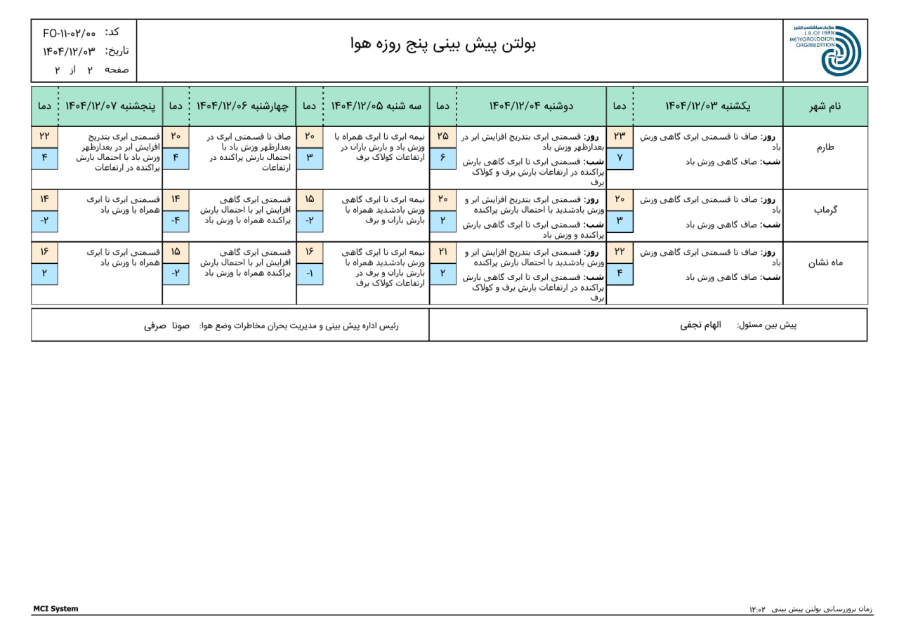 ⚡️ سهشنبه ۵ اسفند: وزش باد نسبتاً شدید تا شدید با احتمال خیزش گرد و غبار، بارش باران با احتمال رعد و برق، در ارتفاعات کولاک برف