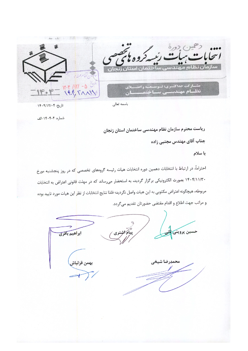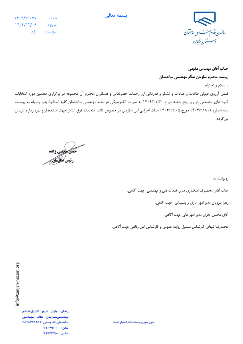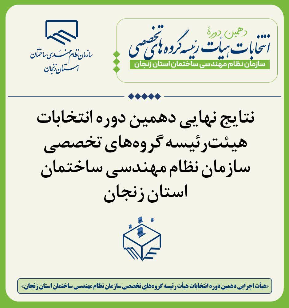 اعلام نتایج قطعی و انتشار آرای مأخوذه دهمین دوره انتخابات اعضای گروههای تخصصی سازمان نظام مهندسی ساختمان استان زنجان