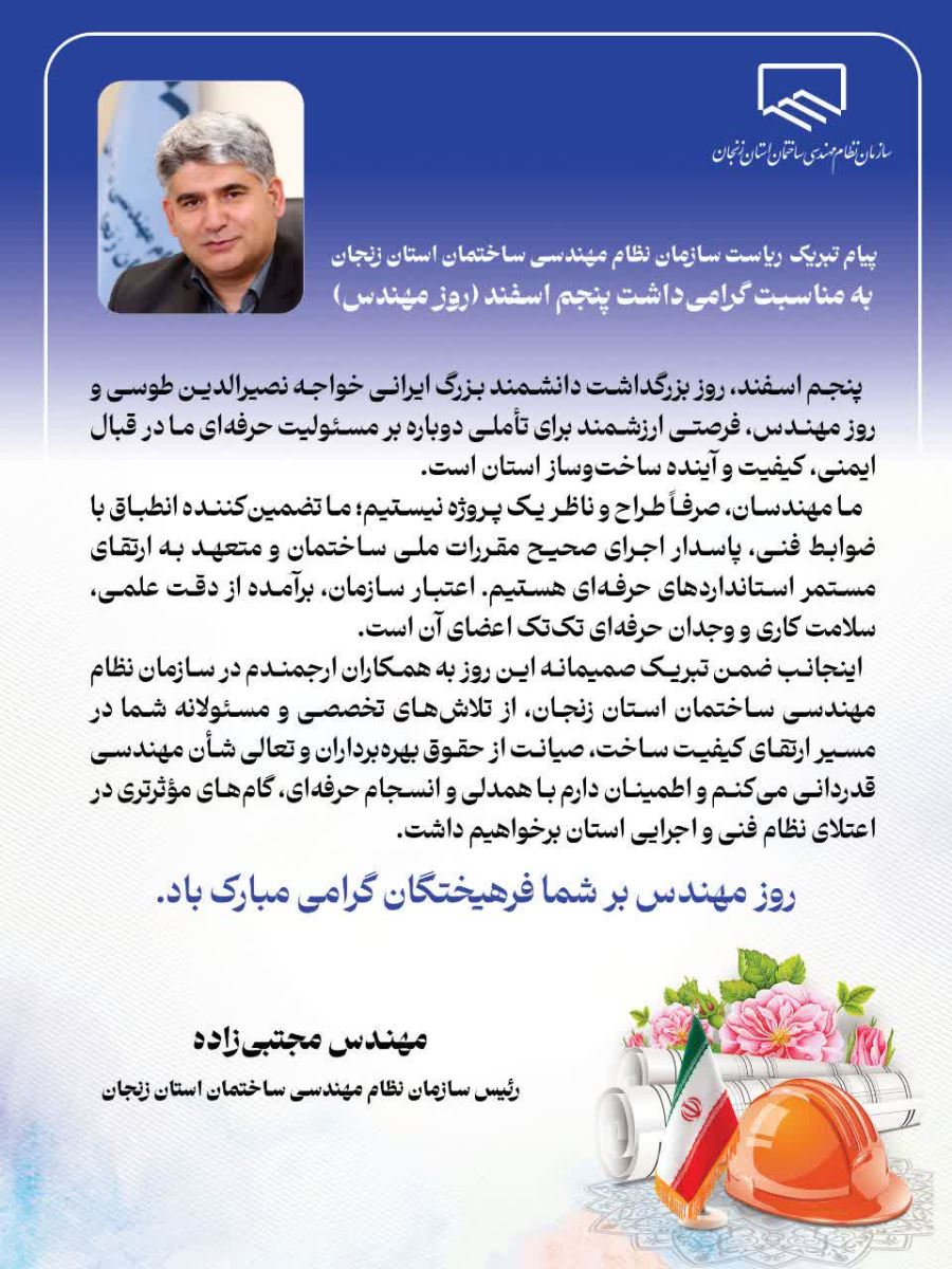 پیام تبریک مهندس حسن مجتبیزاده، ریاست سازمان نظام مهندسی ساختمان استان زنجان، به مناسبت پنجم اسفند، گرامیداشت روز مهندس