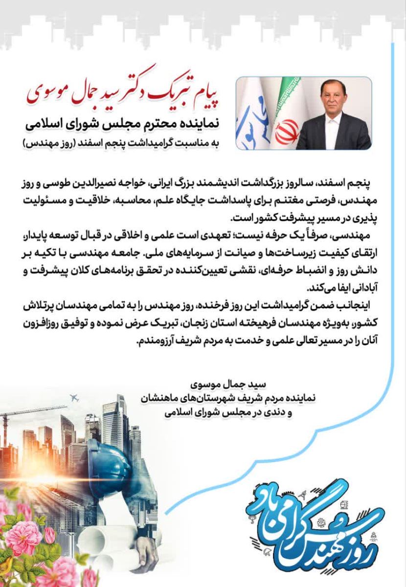 پیام تبریک دکتر سیدجمال موسوی؛ نماینده محترم مردم شریف ماهنشان و دندی در مجلس شورای اسلامی، به مناسبت پنجم اسفند، روز مهندس