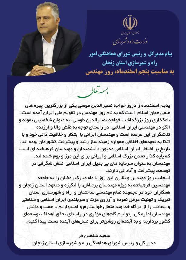 پیام تبریک مهندس سعید شاهینفر، مدیر کل محترم اداره راه و شهرسازی استان زنجان، به مناسبت پنجم اسفند، روز مهندس
