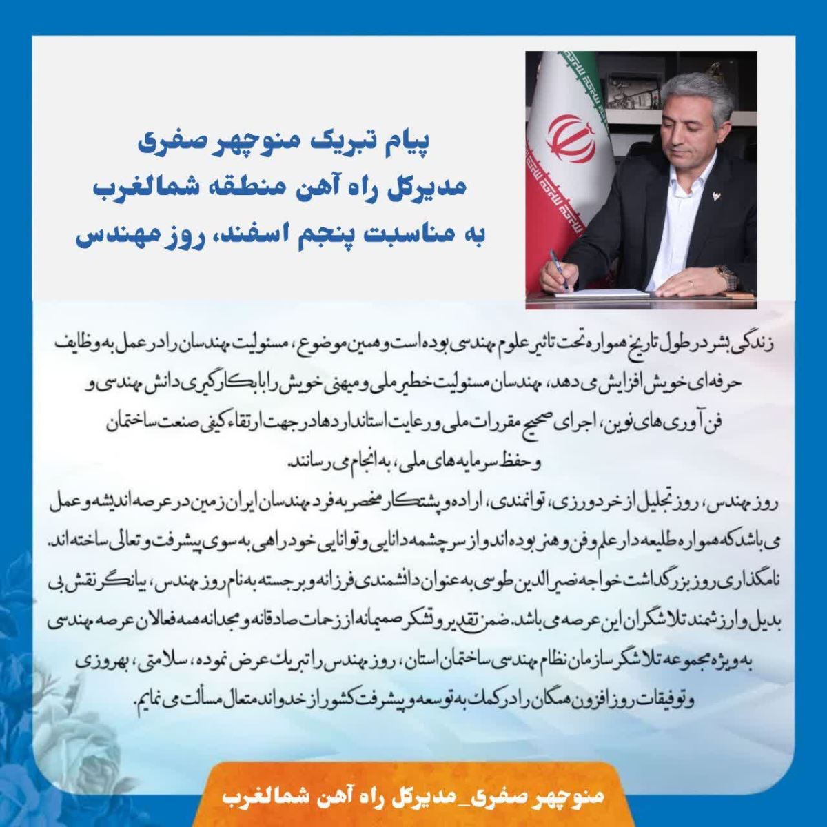 پیام تبریک مهندس منوچهر صفری، مدیر کل محترم راه آهن منطقه شمال غرب، به مناسبت پنجم اسفند، روز مهندس